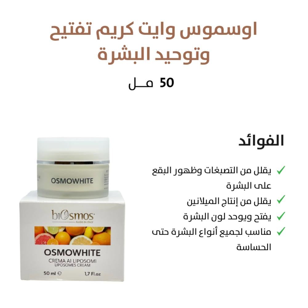 - اسموس وايت كريم تفتيح وتوحيد البشرة: كريم فعال لتوحيد اللون، ترطيب البشرة، ومنحها ملمسًا ناعمًا ومتجانسا.