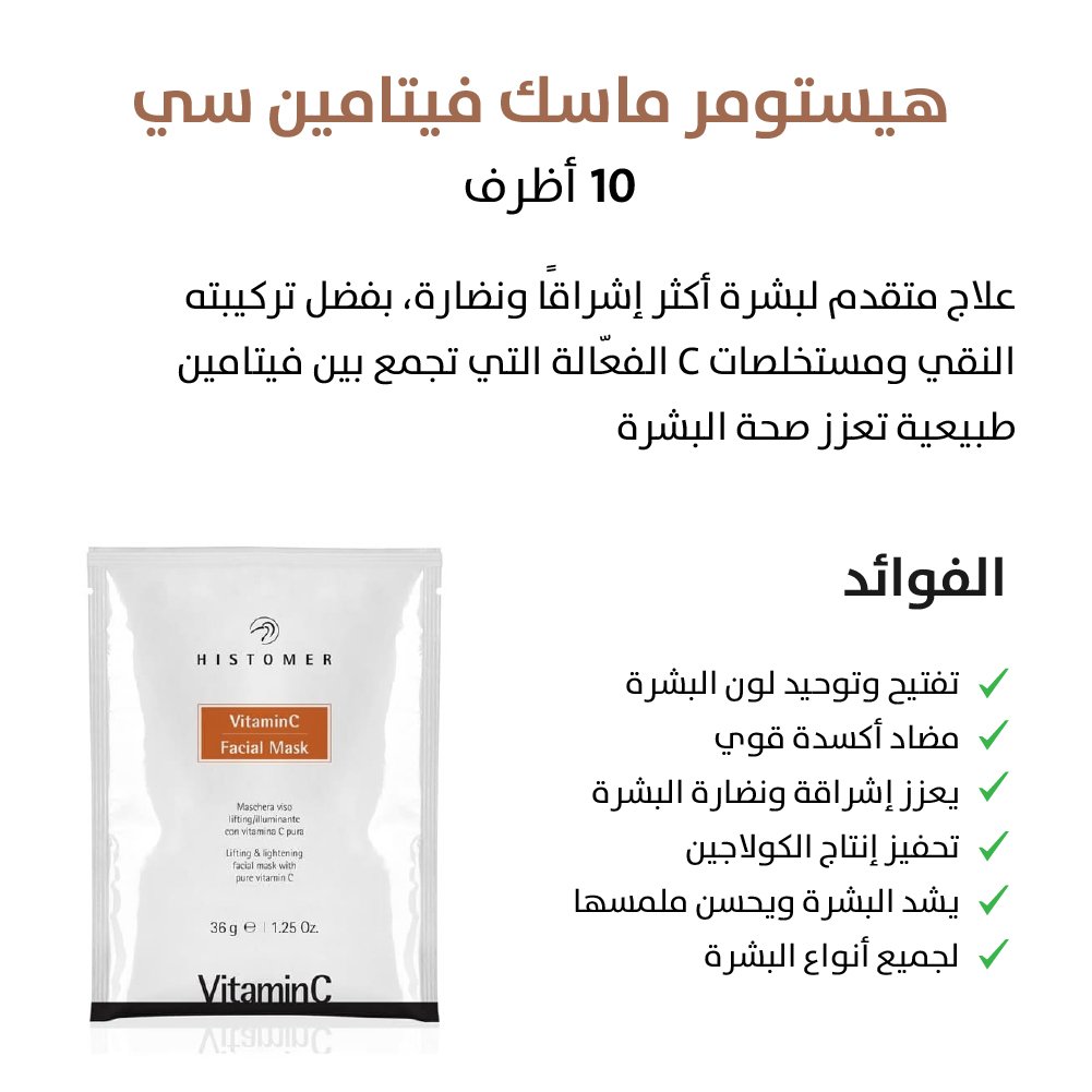 - هيستومر ماسك فيتامين C: ماسك غني بالفيتامينات لترطيب البشرة ومنحها إشراقًا واضحًا وتقليل التصبغات.