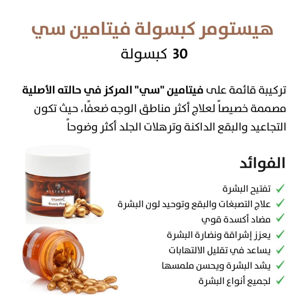 - هيستومر كبسولة فيتامين C: مضاد أكسدة قوي يساعد على تفتيح البقع الداكنة وتحسين إشراقة البشرة.